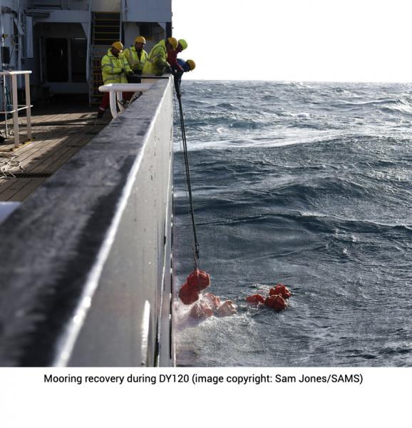The moorings we are recovering during DY120 have survived for two years in the Atlantic Ocean, weathering some of the roughest seas on the planet. The data contained in these moorings adds to four years of existing OSNAP data, so increases the total duration of our time series by 50%, a significant boost to our understanding. Each mooring consists of tens of instruments distributed along a wire, which is anchored to the seabed and kept vertical by a series of buoyant floats. Due to the depth of the ocean basins, most of the moorings are several kilometres long, so the task of recovering each mooring intact onto a relatively small vessel, downloading data and redeploying in precisely the same location is non-trivial. We have now moved from the Rockall Trough into the Iceland Basin, and each successful mooring turnaround feels like a significant triumph given the challenges in getting to this point.