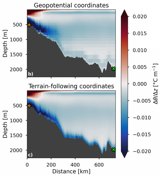 In the real ocean, the very cold and dense Arctic water flows down the slopes downstream of the sills, entraining and mixing with some of the overlying water, but nevertheless maintaining a temperature colder than 2°C. In the model, by contrast, the blocky topography means that the water cascades over a series of ledges, mixing with the surrounding water at each step, resulting in water that enters the North Atlantic a degree or more warmer than it should be. Mattia Almansi at NOCS is developing a new hybrid vertical coordinate for the model that lies at constant depths (“geopotential surfaces”) in the upper ocean, but gradually deforms below 1,000m depth, eventually following the sloping terrain of the sea bed, allowing bottom flows to be much more naturally represented. Figure 1 (right) shows the vertical temperature gradient on a section downstream of the Denmark Strait (between Greenland and Iceland), and shows that the hybrid coordinate simulates the cold bottom plume much better than the default version.