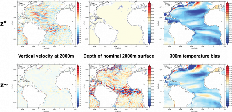 The second strand of model improvement is aimed at tackling the numerical mixing resulting from the vertical motions associated with internal waves and tides. In reality, these simply move water up and down in the water column, only mixing to any significant extent where these waves break. In the model, however, each time a wave carries water across the fixed coordinate surface some mixing occurs, and this results in unrealistic drifts in water properties over time. Alex Megann at NOCS has implemented a new flexible coordinate system called z~ (“z-tilde”), which allows the coordinate itself to move up and down with the waves on time scales shorter than a few days, while reverting to fixed depth levels on longer time scales. This has been tested in simulations with and without tidal forcing, and in both cases it significantly reduces the amount of spurious mixing. Figure 2 (below) shows the instantaneous vertical velocities and level depths at 2,000m with both z* and z~ in the Atlantic, where internal waves with periods between 13 and 16 hours and amplitudes of up to 50 metres per day propagate equatorward. It illustrates how vertical motions from vertical velocities in the fixed z* case are transformed into displacements of the coordinate surface, and also shows that the large-scale temperature biases at a typical thermocline depth in the model (right-hand panels) due to unrealistically high rates of mixing are reduced by almost 50%.