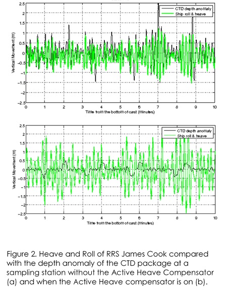 As well as moving horizontally, the ship is subject to moving vertically (heaving and rolling). The heave of the ship adds another dimension to the motion the CTD experiences as it travels through the water. When the CTD is moving up through the water column reaching desired sampling depths, the rosette is ‘parked’ before samples are taken, this settles the wake caused by the movement. In times of significant ship heave and roll, the turbulence and wake caused by the rosette cannot be minimised at these parking depths and has significantly affected data streams in the past.