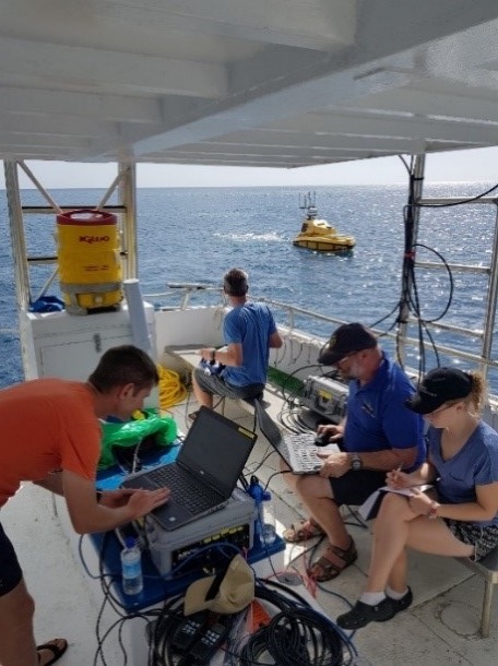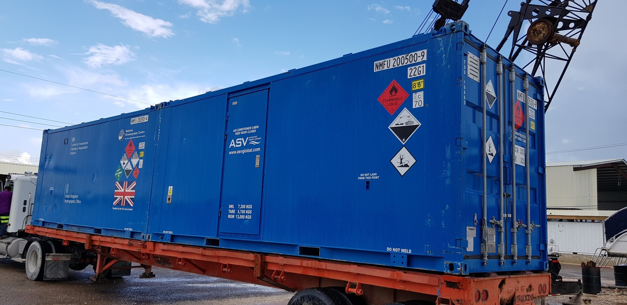 The Operations Container is a 20’ ISO container that has been converted into an insulated, air-conditioned control centre for the USV. It provides a location where scientists can work and analyse data. It can be powered either from shore power or from its own diesel generator, and it houses the communications equipment required for communication with the USV. Guarding can be installed on the roof of the container to provide a raised viewing platform, and an extending communication mast increases the operational range of the USV.The container can be installed in the deck of a suitable vessel, as seen in the picture on the right. The Operations Container can easily support four scientists and has a video wall, networking and bulk data storage capability.