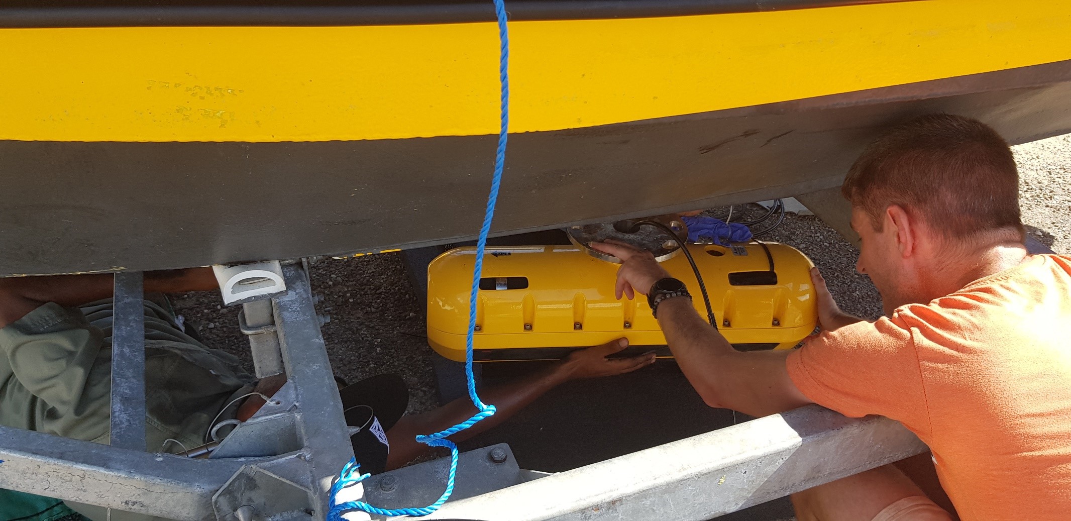 The vehicle’s payload computer and installed sensors are powered by a 240V 50Hz inverter. Sensors are mounted to a plate (hich is lowered from the hull of the vehicle when in operation, and housed inside the hull when not in use. The ability to raise and lower the payload prevents damage to sensors when moving the C-Worker 4 in and out of the water and in shallow water. When the vehicle is stationary, the sensors sit at 0.65m depth and when in motion, the sensors sit at ~0.55m.