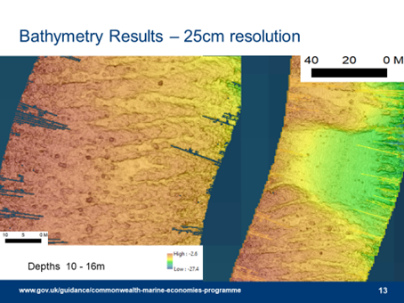 Multi-Phase Echo Sounder (MPES) providing bathymetry (12 x water depth), side scan sonar and sub-bottom profiling. |