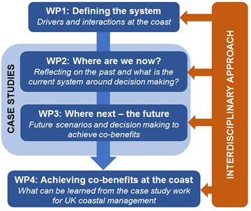 We will start by focusing on a generic coastal system. Because of the multiple spatio-temporal scales inherent to coastal systems, we will then step down in scales to focus on our four case studies. We will involve agencies with the statutory duty in each case study area as well as a broader set of stakeholders and experts throughout the project. They will be brought together for workshops at four points through the project to facilitate co-learning across agencies and broader interest groups.