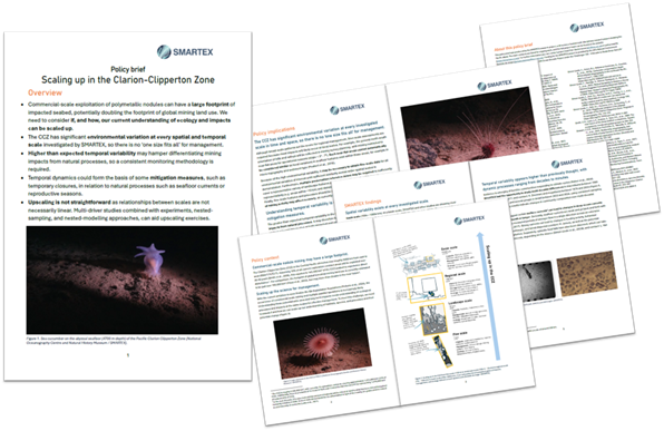 SMARTEX has worked closely with UK government departments and agencies to ensure the latest research informs national positions on deep-sea mining. A science-policy workshop was hosted in Edinburgh in November 2024 bringing together researchers and UK policy officials to promote dialogue on various key topics including scale, recovery, and uncertainty. The project has participated in the UK Deep-Sea Mining Environmental Science Network and contributed to briefing materials for national (e.g. Parliamentary Office of Science and Technology note on DSM) and international discussions (e.g. Brief of the UN Scientific Advisory Board on DSM, and a research brief on CCZ biogeography). SMARTEX research has also been referenced in parliamentary questions including those related to the long-term effects of deep-sea mining (HL3503, HL3504, HL3506), highlighting its role in supporting evidence-based decision making.